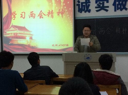 为响应学校的号召,普及“两会”要点,宣传“两会”的重要思想,2015年3月26日晚,化环学院全体大一同学在向学楼开展了“中国梦、绿色梦”主题团日活动。