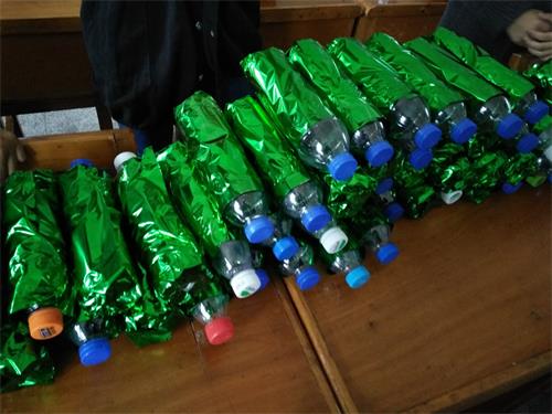 加油棒的制作材料是由废弃的矿泉水瓶和硬币组成,制作过程简单,同学们先把事先准备好的一个空矿泉水瓶外包好一层彩纸,接着把剪碎的彩纸和硬币混合后放入矿泉水瓶中,加油棒就成功的做好了。活动过程中,大家各自分工,其乐融融,干劲十足,经过十几分钟的努力,每人都制作好了两个加油棒。加油棒的制作虽然简单但代表了同学们的一片心意。