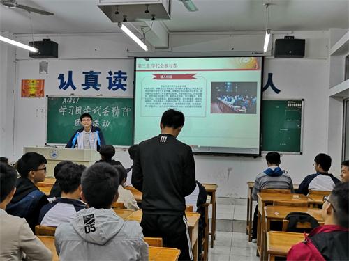 随后,团代会、学代会学生代表前往各班宣讲,向同学们详细叙述了过去七年学校共青团工作的成绩和经验以及新形势下共青团事业的发展要求,阐述了下一阶段共青团工作的指导思想与改革目标,并呼吁同学们要把学习贯彻团十八大精神同学习贯彻党的十九大精神紧密结合起来,切实肩负起新时代青年的使命。