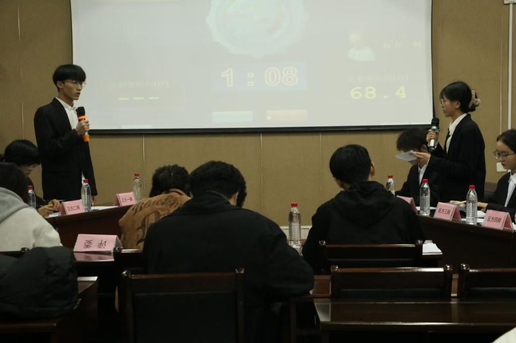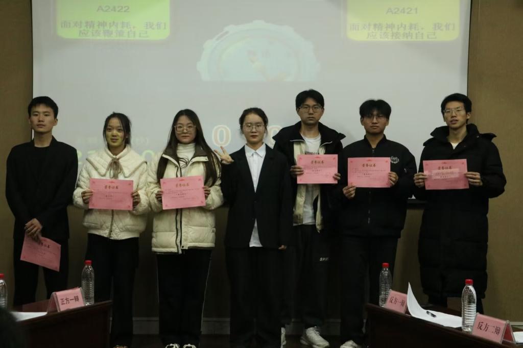 本次辩论赛决赛的辩题为“面对精神内耗,我们应该鞭策自己”,正方是来自A2422班的选手,反方是来自A2421班的选手,在双方辩手简洁的自我介绍后,比赛正式开始,双方的辩手都围绕本次辩题展开了激烈辩论激战,双方你来我往战况十分激烈,每位辩手都反应灵敏,正反方唇枪舌战,对对手都提出了自己鲜明的观点,随着辩论进入白热化,双方辩手更是言辞犀利,滔滔不绝,他们用自己的智慧和口才诠释自己的观点,展现出当代青年的思维表达能力和风貌。
